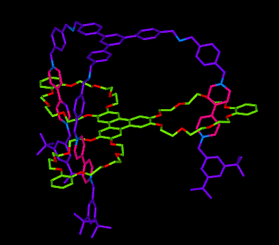 さてStoddart教授の最新作は「分子エレベーター」です。下のようなクラウンエーテル環を3つ持った大がかりな分子(黄緑)が、酸・塩基の切り替えで上下する仕掛けです(Science 2004, 303, 1845)。「エレベーター」の釣り上がる力は1分子あたり200ピコニュートンほどと見積もられていますから、相当にパワフルなエレベーターといえそうです。