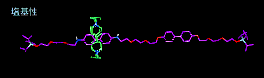 それを実現したのが下の図です。このロタキサンには「糸」にあたる紫の分子に、2ヶ所のビフェニルユニットが含まれています。左のビフェニル部分には窒素が直結しており、塩基性(アルカリ性)の状態では強くマイナスの電荷を帯びていますが、酸性になると水素イオンがくっつき、プラスの電荷を帯びることになります。つまりパラコートのリングは、塩基性の状態ではプラスとマイナスで引きつけ合って左に、酸性ではプラスとプラスではじかれて右に移動するということになります。