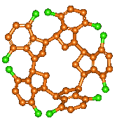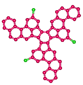 こうなれば目に見える量のフラーレンを得るまでにはあと一歩です。2002年、Scottは上の分子の3ケ所に塩素原子を導入した分子を11段階で合成し、これをFVP処理することによって、ついに史上初の化学合成フラーレンを得ることに成功しました。切断されやすい塩素原子を、うまくキーポイントとなる場所に配置したのが成功の鍵です。