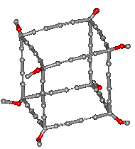 Diedrichらは最近になって下のようなキュバンの親玉のような分子を合成し、これがやはりMS中でC52〜56、C112などのフラーレンに変化することを報告しています。これらはMSによるイオン化の条件で炭素骨格がくっついたり切れたりを繰り返し、最後に最も安定なフラーレンに落ち着いているものと考えられます。サイコロにレーザーを当てるとボールに化けてしまうわけで、なかなか面白いことが起こるものです。