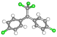 DDTという名称は、ジクロロジフェニルトリクロロエタンの頭文字を取ったものです(ただし現在の命名ルールでは、1,1,1-トリクロロ-2,2-ビス(4-クロロフェニル)エタンという名称になります)。DDTが最初に合成されたのは1874年のことですが、スイスのミュラーによってその強力な殺虫効果が発見されたのは1939年になってからのことでした。下に示す通り5つの塩素原子(黄緑)を含んでいます。