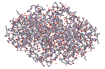 ペプチドとタンパク質の間に明確な区別はありませんが、慣例としてだいたいアミノ酸の数が100個以上のものをタンパクと呼んでいます。一例として、アミノ酸508個から成るアルコールデヒドロゲナーゼという酵素を挙げておきましょう。お酒を飲んだ時に肝臓の中でアルコールを処理する役回りの酵素で、ご覧の通りぱっと見には何がどうなっているのかわからないくらいの巨大分子です。