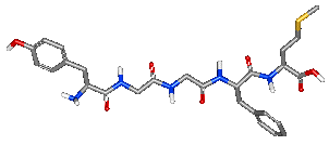 もうひとつペプチドの例を挙げておきましょう。下の化合物は脳内麻薬として知られるMet-エンケファリンというペプチドで、5つのアミノ酸がつながってできています。この配列はきわめて厳密で、別のアミノ酸が入り込んだり、並ぶ順番が変わったりすると脳内麻薬としての活性は全くなくなってしまいます(注:右端のアミノ酸がロイシンに変わったものはLeu-エンケファリンと呼ばれ、同等の活性があります)。