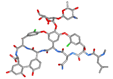 現在、MRSAに対して安心して使える抗生物質はバンコマイシンのみです。バンコマイシンは下に示すような複雑な化合物で、1956年の登場以来40年以上も耐性菌が出現せず、人間側の「最後の切り札」としての地位を守り続けてきました。