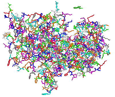 下にCOXの絵を示しておきます。右上に浮かんでいる緑色がアスピリン分子、色とりどりの大きな塊がCOX分子です。