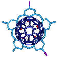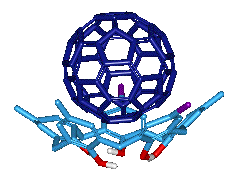 例えばカリックス[8]アレンのある誘導体は、C70やC76の混じった中からC60だけを見分けて包み込むことが知られています。グラファイトを蒸発させて作った炭素のススはいろいろのサイズのフラーレンの混合物ですが、これを利用することによって大量にC60だけを精製することが可能になりました。下にはカリックス[5]アレンが、C60を捕らえた画像を示しておきます。