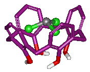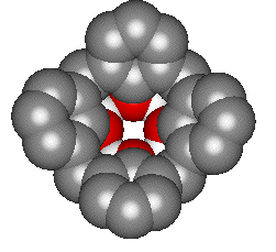 カリックスアレンの「杯」の名はダテではなく、その窪みの中には金属イオンやクロロホルムなどの小分子をつかまえることができます。つまりシクロファン類と同様、カリックスアレンは「ホスト分子」として働くことができるわけです。変形しにくいフェノール環が「ちょうつがい」となるメチレン単位で結ばれていますので、この分子は適当な硬さを持ちつつもいろいろな大きさのゲスト分子に対応できる柔軟性を持つのです。