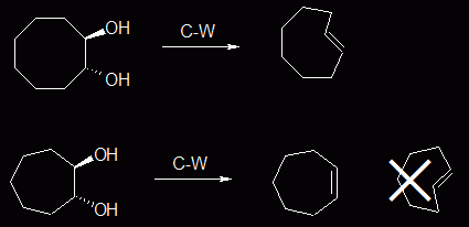 この反応をtrans-1,2-シクロオクタンジオールに適用すると、目的のtrans-シクロオクテンが得られます。ところがtrans-1,2-シクロヘプタンジオールに適用すると、得られたのはtrans体ではなく、普通のcis-シクロヘプテンでした。