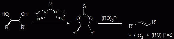 では7員環以下のシクロアルケンは無理なのか?このテーマに挑んだのも、若き日のCorey教授でした。Coreyは1,2-ジオールをチオ炭酸エステルとし、これをリン化合物で処理することによってsyn脱離させ、オレフィンとする反応を開発しています。これはCorey-Winter反応と呼ばれ、形式的にはオスミウムによるオレフィンの酸化の逆反応に当たります。