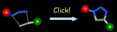 有機アジド化合物とアルキンは、付加反応を起こして1,2,3-トリアゾール環を形成します。この反応は他の多くの官能基や溶媒に影響されず進行し、収率よくトリアゾールが得られます。また反応後に余計な副生成物ができず、精製を必要としません。さらに、Cu(I)触媒を加えると反応速度は100万倍にも向上し、ほぼ100%の選択性で下図のような1,4-付加体を与えます。