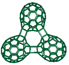 前回紹介したC60の二量体(C120)を合成した京大の小松らのグループが、今度は三量体を作り出しました。直線状、くの字状のものもありますが、ここでは三角形のものを示しておきます。C120はその形から「バッキーダンベル」と名付けられましたが、これは「バッキークローバー」とでも命名すべきでしょうか?