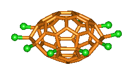 ロシアのチームはフッ素をフラーレンに作用させて、ユニークな化合物を次々と作り出しています。上下に押しつぶされたような形のC60F20は、フラーレンの「赤道」にあたる部分に20個のフッ素がベルト状にくっついた化合物です。彼らはこの化合物に「サターネン」というあだ名をつけました。もちろんこの分子を土星(Saturn)に見立てての命名です。