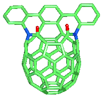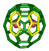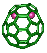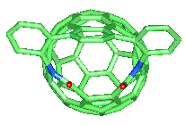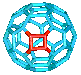 上のC180では橋架け部分に4員環が入っていますが、Rubinらはボール自体に4員環(強調するため赤で示した)を組み込んだフラーレンを作り出しています。これはC60に細工をして炭素原子を2つもぐり込ませた(C62)ものです。とはいえこの分子は4員環部分にひずみが集中するため不安定で、ほんの一瞬の寿命しかないようです。