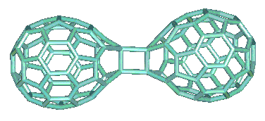 京大の小松らのグループはC60と青酸カリと粉砕用鉄球を鋼鉄のカプセルに入れて、毎分3500回の高速振動を与えるという実験を行ないました(なんでこんなことを思いついたんだろうという気がするのですが)。と、予想しなかったことにサッカーボールが2つくっついたC120という全く新しい分子が生成したのです。この分子はその形からバッキーダンベル(buckyはbuckminsterfullerene(C60)の愛称)と名付けられました。ダンベルを加熱すると中央の結合が切れて、もとの2つのボールに戻ります。