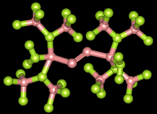 この分子は、R-Br2Si-SiBr2-Rという四臭化物をカリウムで還元して得られました。炭素同士の三重結合は一直線に並びますが、ケイ素の場合はご覧の通りジグザグに折れ曲がった構造をとります。これは以前から理論計算で予言されていたところでした。