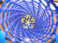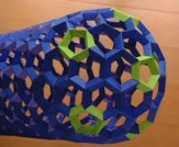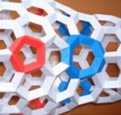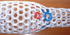 このように、6員環だけだとまっすぐなチューブになりますが、そこに5員環を取り込むと丸くドーム状になり、管が閉じることがわかります。では7員環が入るとどうなるでしょうか?