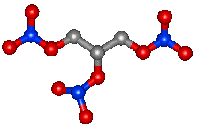 時代が下り、化学が発達してくるにつれてさらに高性能な爆薬が出現してきました。代表的なのはニトログリセリン(下左)で、その名の通りグリセリンの3つの酸素がニトロ化(正確には硝酸エステル化)されたものです。ちょっとした熱や衝撃を与えるだけでもすぐ爆発する、極めて危険な化合物です。