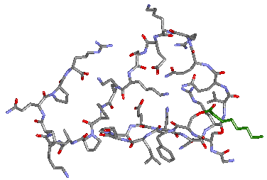 前回挙げたインスリンやLH-RHの後にも、ペプチドホルモンは今なお続々と見つかってきています。ホルモンは微量で体の働きを整える化合物ですから、その発見には大きな学問的インパクトがあるのは当然のことです。近年その中でも非常に大きな注目を浴びたのが、1999年に国立循環器病センターの寒川(かんがわ)らによって発見された「グレリン」という化合物です(下図)。28個のアミノ酸に加え、炭素数8の脂肪酸(緑色で示した)がついているのが大きな特徴です。