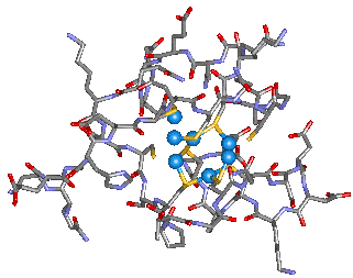 メタロチオネインの大きな特徴は、普通のタンパク質には1〜2%程度しか存在していないアミノ酸のシステインを20個も(全体の3分の1)含んでいることです。システインの硫黄原子は銅・銀・亜鉛などの原子とよく結合し、上の絵では7つの銅イオンを抱え込んでいます。