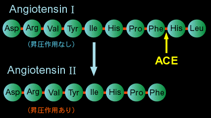 ACEというのはアンジオテンシン変換酵素(angiotensin converting enzyme)の略で、文字通りアンジオテンシンIをIIに変換する酵素です。一種のプロテアーゼ(正確にはペプチダーゼ・注1)に分類されますが、タンパク質ならたいてい何でも分解するペプシンやトリプシンと違い、ACEは主にアンジオテンシンIだけを見分けて切断します。
