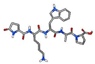ただしこのペプチドは飲み薬としては使えません。ペプチドは食品に含まれるタンパク質同様、胃腸でばらばらに消化分解されてしまいますので、有効な形のまま血管に届かないからです(蛇毒は血管から注入されると毒になりますが、口から飲んでも大丈夫というのはこういうことです)。よって飲み薬を作りたいなら、この活性を保ったまま、ペプチドでない化合物に変換してやる必要があります。