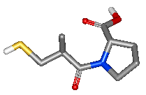 またACEの中心にはペプチド鎖切断に中心的な役割を果たす亜鉛原子がありますので、これに強く結合する硫黄原子(下図黄色)を導入することで、大きく活性が上昇しました。こうして誕生した経口降圧剤が「カプトプリル」で、史上初めて合理的な薬剤設計によって誕生した薬として有名です。この後にも同じ考え方によって各社から数多くのACE阻害剤が登場し、多くの成人病の予防に大きな役割を果たしました。