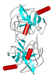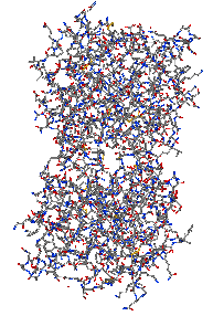 しかしペプシン自体もタンパクなのだから、ペプシン自身も胃酸でほどけてしまわないのでしょうか?上左の図を見ていただければわかる通り、ペプシンは「β-シート」(左上の図の水色の矢印)という構造を非常にたくさん含んでいます。これは酸などによってほどけにくい構造であり、このためペプシンは強い胃酸の中でも平気で活動できるのです。