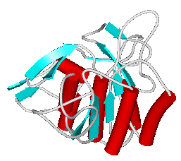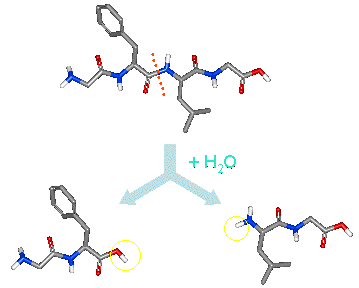 このキモトリプシンは「セリンプロテアーゼ」と呼ばれるタイプで、セリン・ヒスチジン・アスパラギン酸という3種のアミノ酸のトリオが巧妙な連係プレイを行ってタンパク鎖を切断します(詳しいメカニズムのアニメーションはこちら)。最適に配置された周辺のアミノ酸が標的となるタンパク質を見分けて完全に捕らえ、これまた最適な場所に位置する活性中心のアミノ酸が手早くアミド結合を切り離す――。プロテアーゼの素早い仕事ぶりの秘密は、この計算し尽くされたアミノ酸の立体配置によるところが大きいと考えられています。