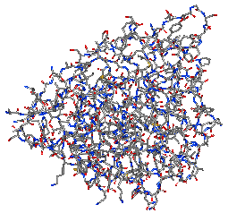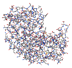 ペプシンの構造を見ると、右上に「くぼみ」があることがわかると思います。これがペプシンの「口」にあたる部分で、ここにタンパク質の鎖をくわえてガブリと噛みちぎるわけです。くぼみの底にはアスパラギン酸というアミノ酸が2つ仕込まれており、これがアミド結合切断の主役を演じます。では他の300以上もあるアミノ酸は役に立っていないのかというとそんなことはなく、他のタンパクを見つけて捕まえるための最適な形状を保つためにはこれだけの数がどうしても必要なのです。アスパラギン酸2つを持ってきただけでは、とてもペプシンのような機能は発揮できません。