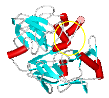 これを防ぐため、ペプシンは「安全装置」つきで作り出されています。ペプシンは326個のアミノ酸からできていると言いましたが、合成されたときにはさらに44個のアミノ酸から成る余分な「腕」がくっついているのです。下の図の左側が「腕」つきの「ペプシノーゲン」で、右のペプシンに比べると黄色の丸で囲ったあたりに余分なアミノ酸が見えます。これはペプシンの「口」、活性中心をふさぐように位置しているのがおわかりでしょう。このためペプシノーゲンはタンパク質を分解する能力を封じられており、この状態では無害です。