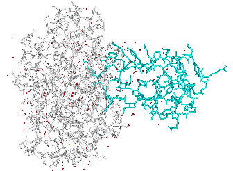 タンパク切断の仕事を終えたプロテアーゼがいつまでも体内をさまよっているのもまた危険な話ですから、これを防ぐ方法も存在しています。例えば小腸で働く消化酵素の一つトリプシンがその役目を終えると、セルピンと呼ばれるタンパクが放出され、トリプシンに取りついてその機能を止めてしまいます。トリプシン(白)の活性中心奥深くまでセルピン(水色)が食い込み、ブロックしている様子がわかると思います。