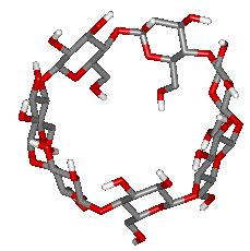 これは身近な分子であるブドウ糖(グルコース)が6〜8つ輪につながった構造の化合物で、一方の口が広い、底の抜けた洗面器のような形をしています。この分子もまた中の空洞にいろいろな小分子を取り入れることが知られており、カリックスアレン、シクロファンと並ぶ超分子化学の主役の一つです。