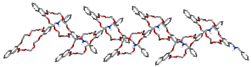 下のように分子内にアンモニウムとクラウンエーテルユニットを持つ分子では、輪の中に次々とアンモニウム部分が首を突っ込み、チェーン状のポリマーを形成します。これは花で作るリングを連想させる構造から、「超分子デイジーチェーン」というちょっと洒落た名前が付いています(Angew. Chem. Int. Ed. 1998, 37, 1294)。