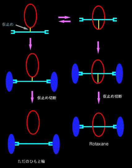 ひもや輪の分子は柔らかくぶらぶらしていますので、一部はひもが輪を通り抜けた状態になります。ここにストッパー分子を両端に取りつけ、その上で仮止めを切断してやればロタキサン分子(上図右側)の出来上がりというわけです。ひもが輪を通っていない状態の分子(左側)もできますが、これは仮止めを切るとひもと輪がバラバラに外れますので、簡単にロタキサンと分離することができます。この工夫により、ただ偶然に頼っていたHarrisonらの場合に比べて数十倍も効率よくロタキサンを合成することが可能になりました。