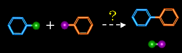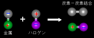陽イオンになりやすい元素としては金属元素、陰イオンになりやすい元素としてはハロゲン類(フッ素、塩素、臭素、ヨウ素)があります。要するに炭素−金属結合を持った化合物(有機金属化合物)と、炭素−ハロゲン結合を持った化合物を混ぜてやれば結合の組み替えが起こり、炭素同士がくっつくということです(実際にはそこまで単純ではありませんが)。