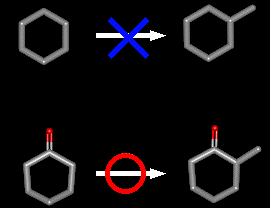 例えば下図のように、何もないところにいきなり炭素の枝を生やすのは不可能ですが、炭素−酸素の二重結合(「ケトン」という官能基)があれば、これを足がかりにその隣の炭素から枝を伸ばすことが可能になります。このように炭素−炭素結合を作るには何かしら「官能基」の存在が必要であり、多くの官能基の反応性を知り尽くしてそれを巧みに使い分け、制御できるのが優れた合成化学者であるといえます。