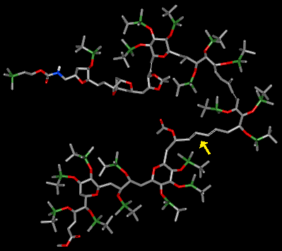パリトキシン全合成中間体。矢印で示したのが鈴木カップリングで作った結合。緑色はケイ素。
